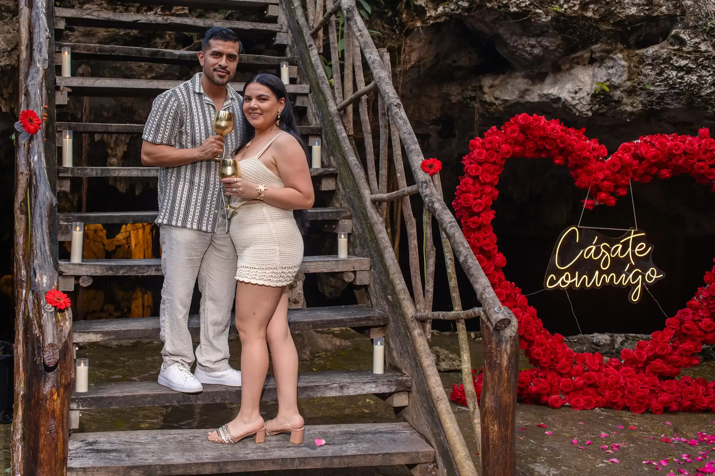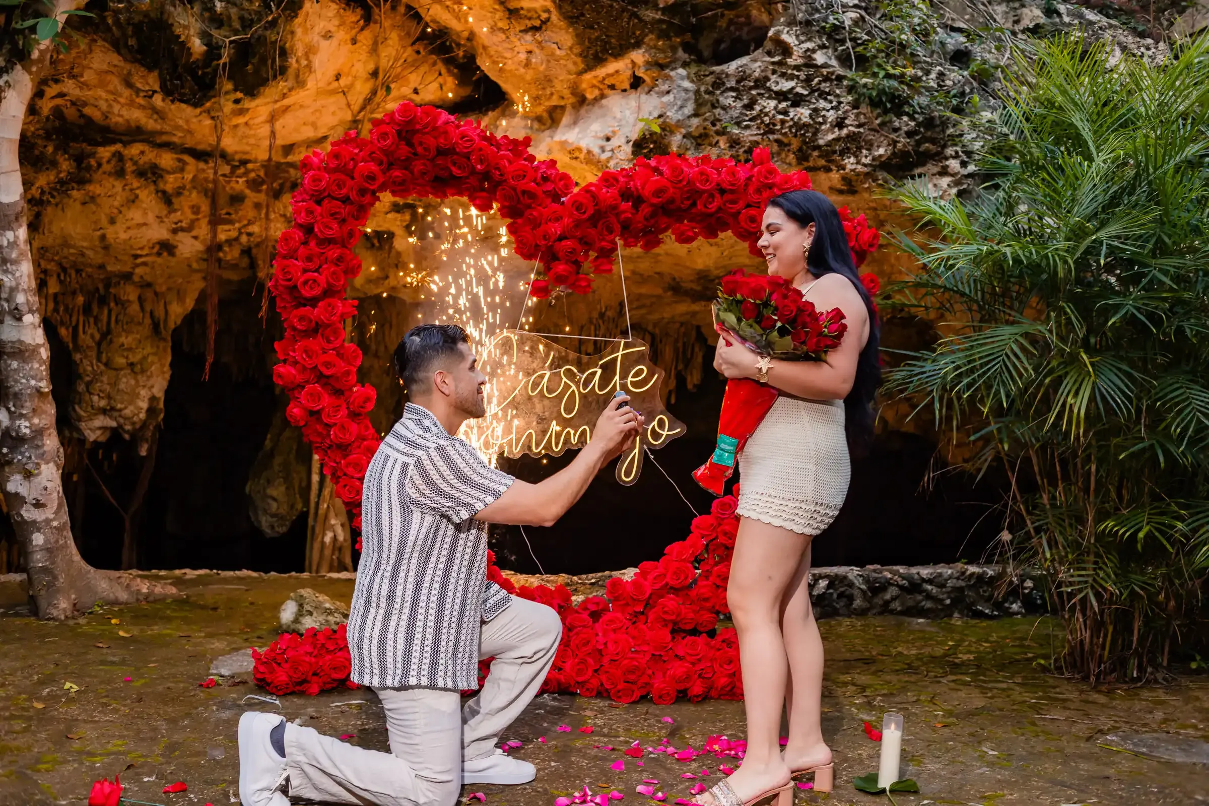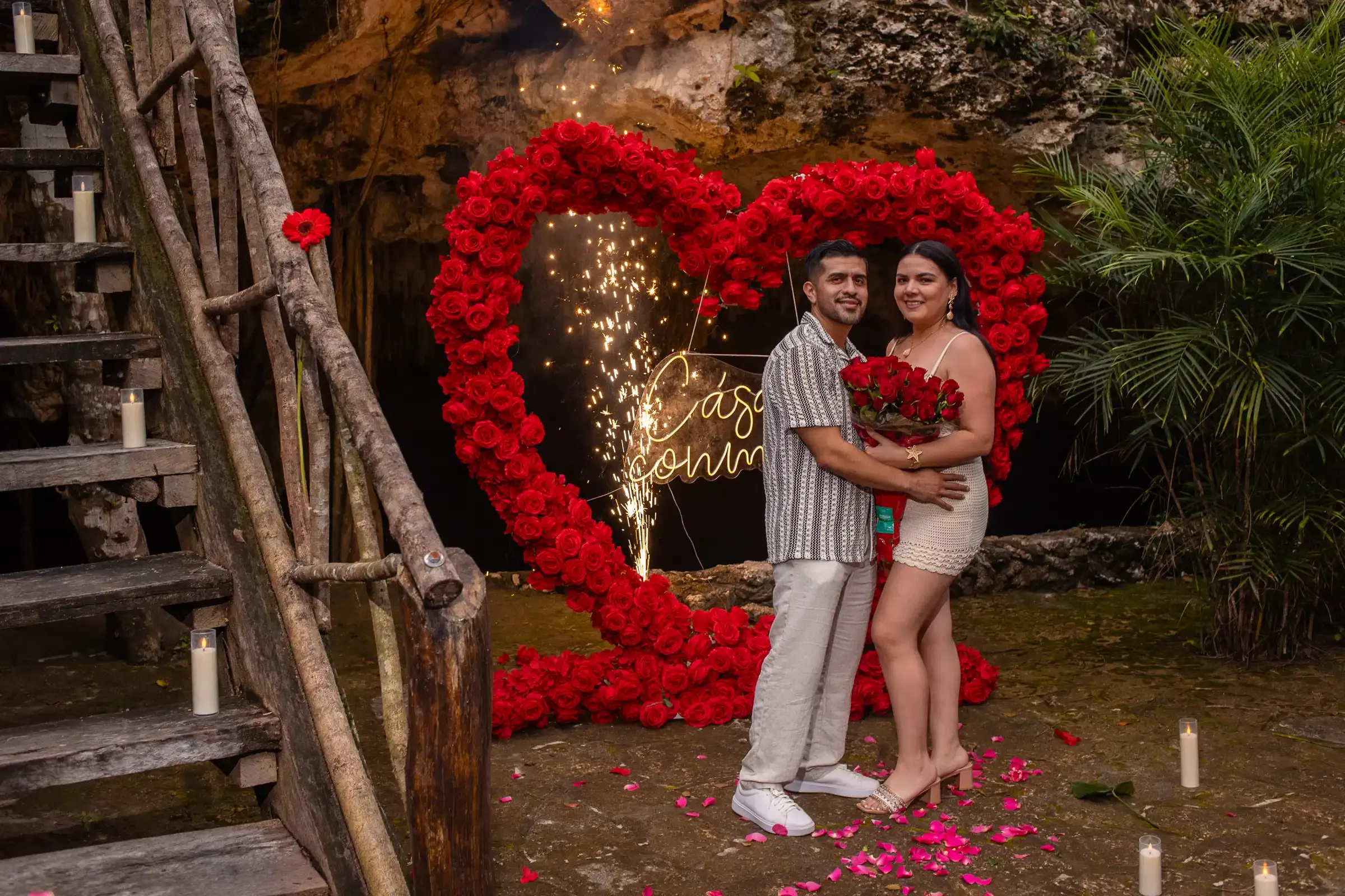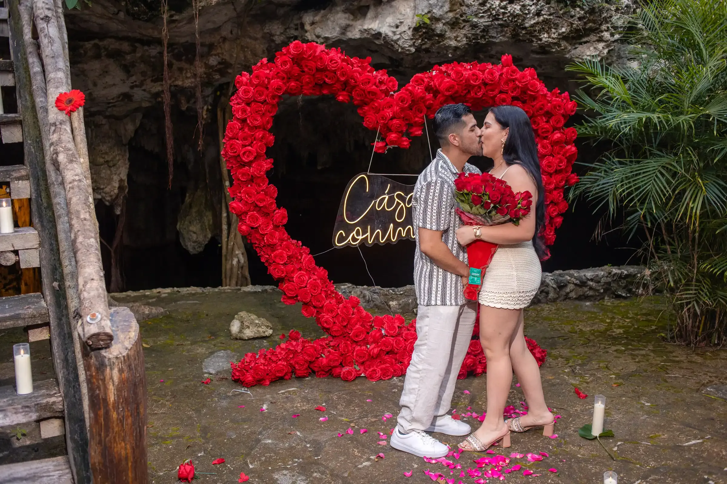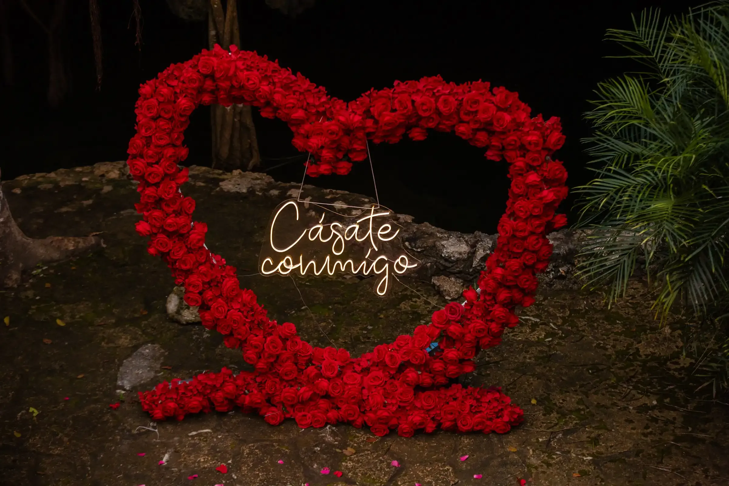 Eduardo wanted every detail to be perfect. As his Tulum engagement photographer, I assisted him in sourcing local vendors to bring his vision to life. He ultimately chose a stunning cenote location that offered the perfect blend of natural beauty and privacy. The centerpiece? A magnificent rose heart and a glowing “Will you marry me?” sign.