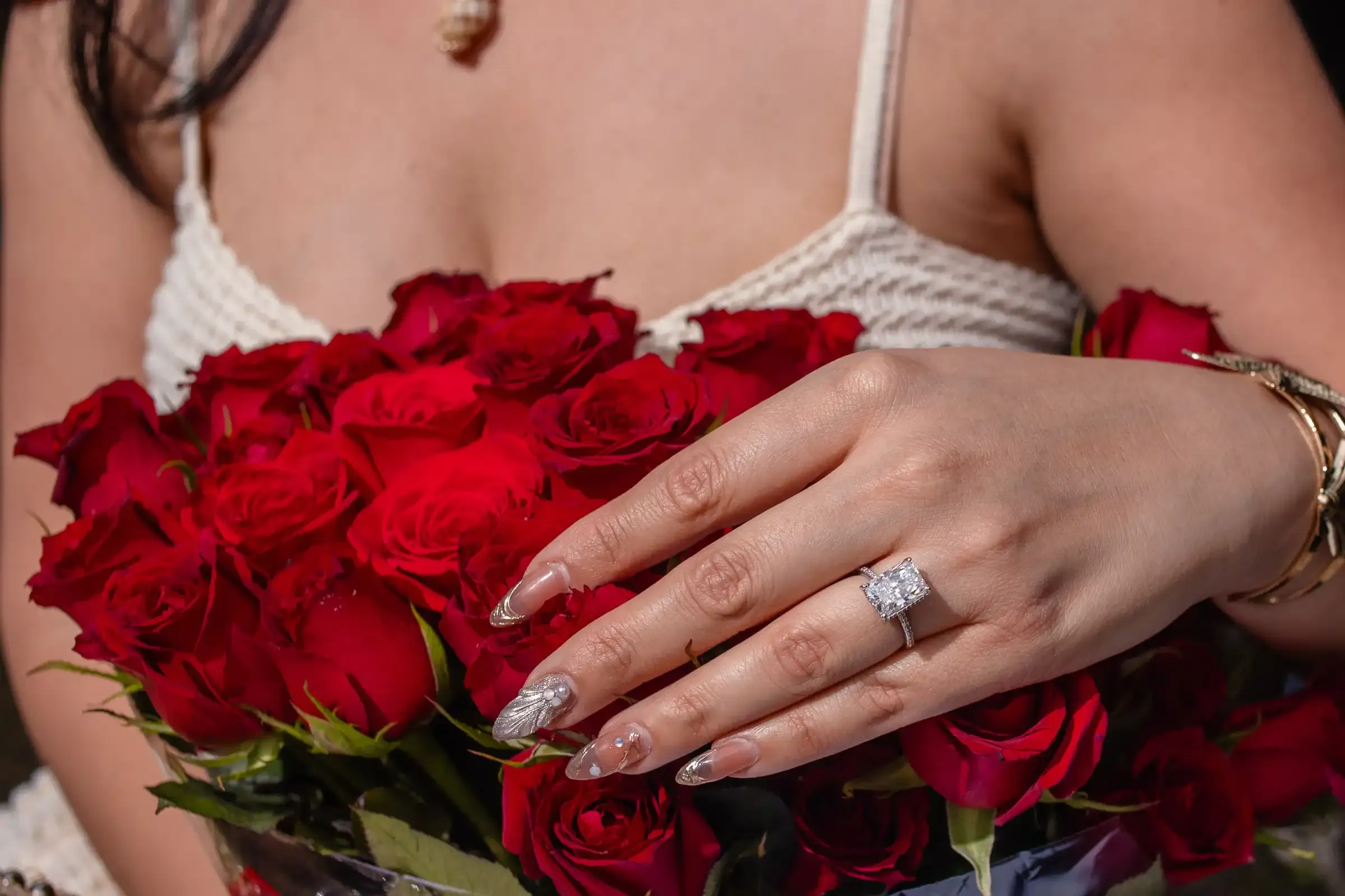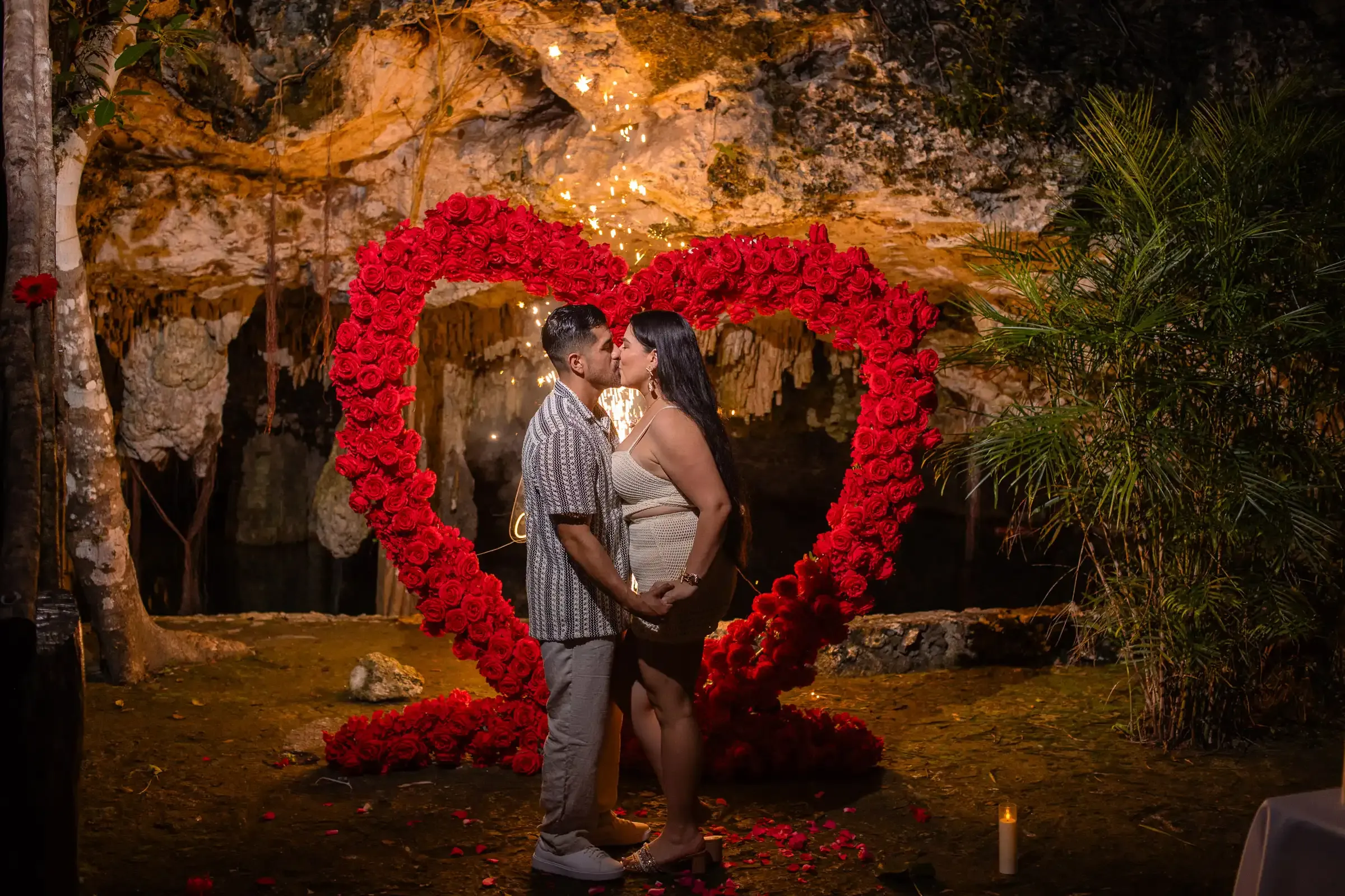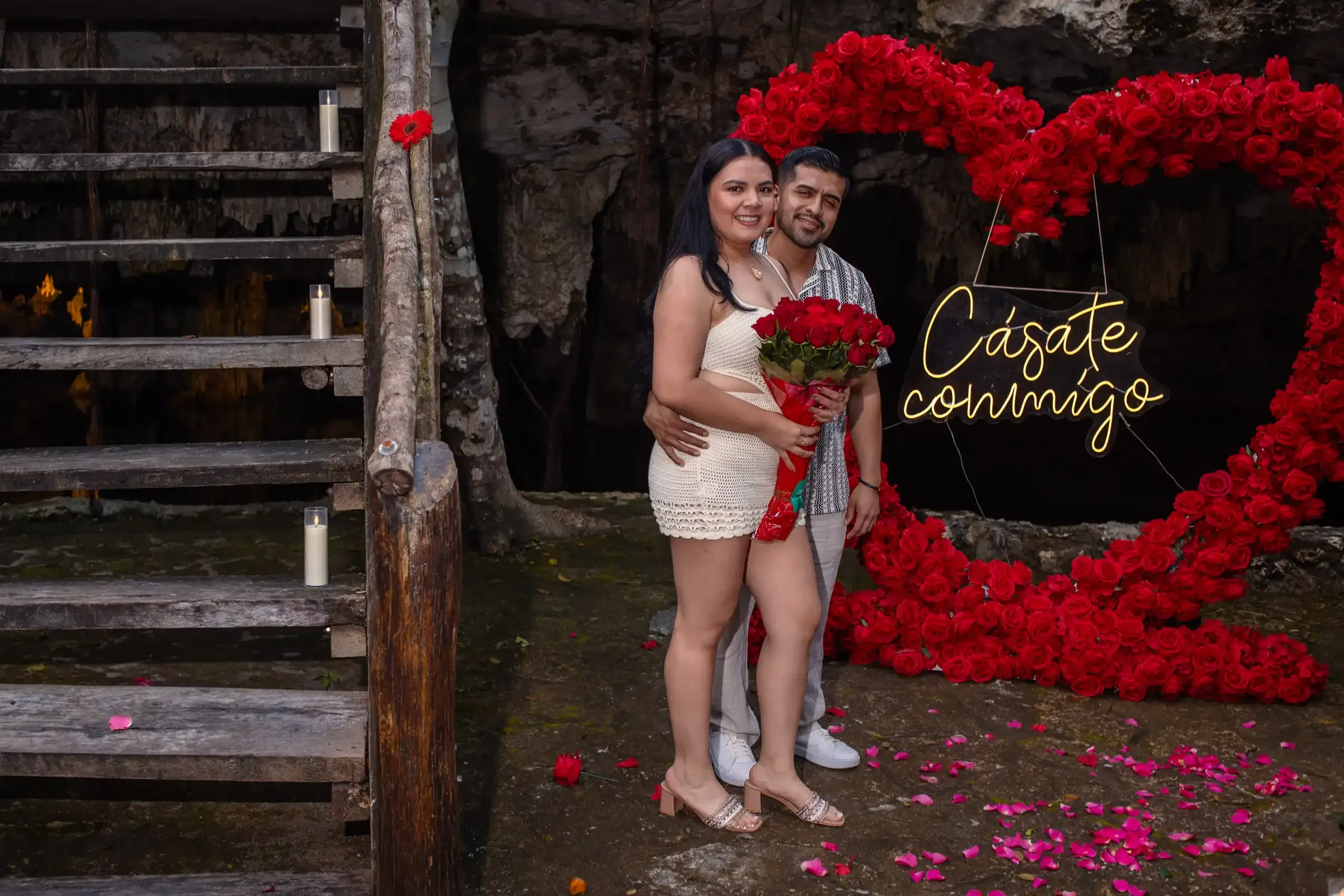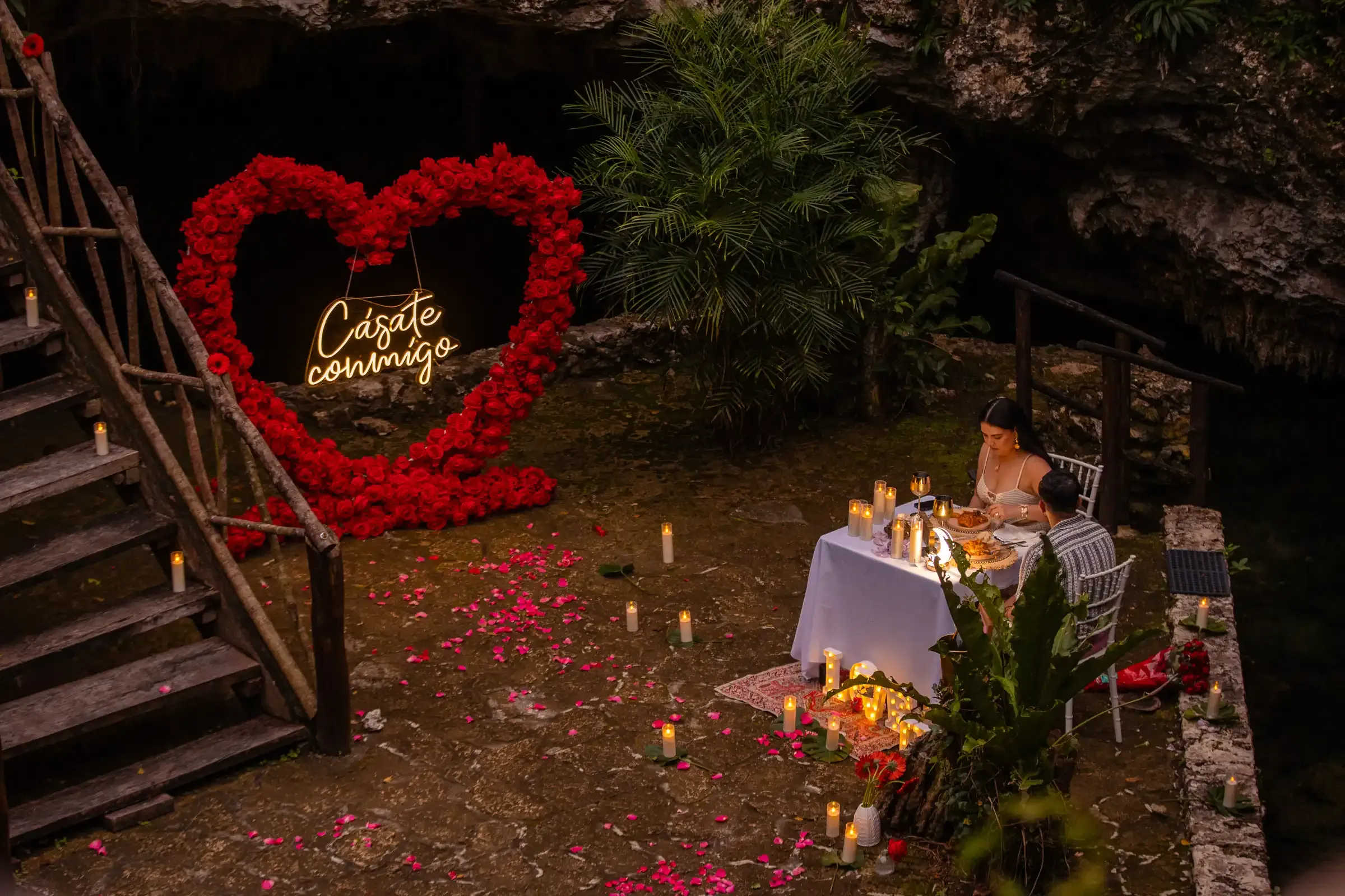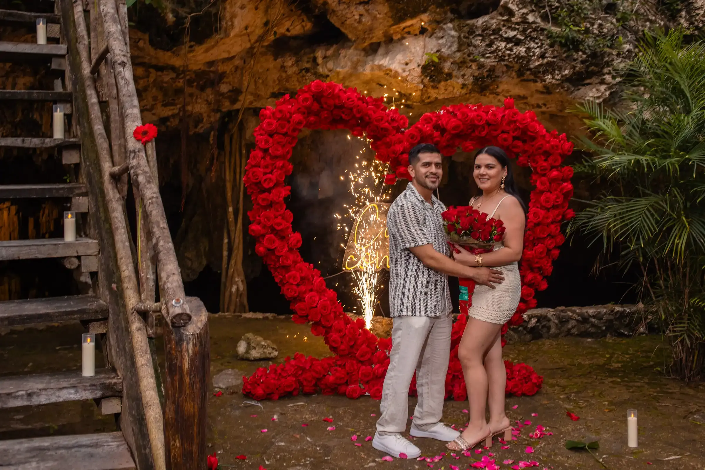 Eduardo wanted every detail to be perfect. As his Tulum engagement photographer, I assisted him in sourcing local vendors to bring his vision to life. He ultimately chose a stunning cenote location that offered the perfect blend of natural beauty and privacy. The centerpiece? A magnificent rose heart and a glowing “Will you marry me?” sign.
