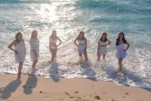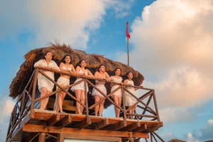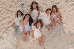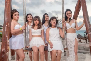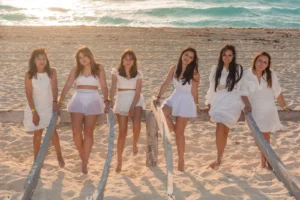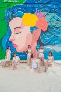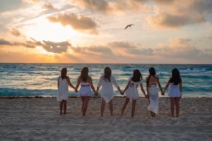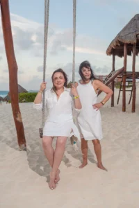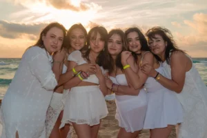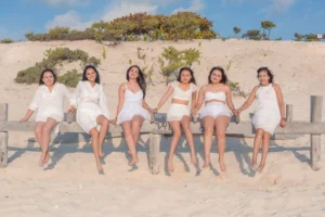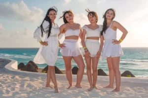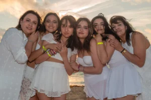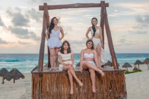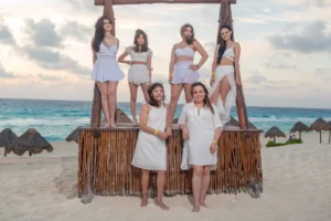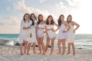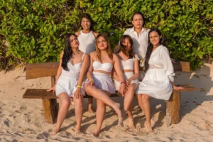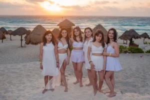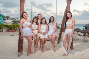 The chosen location was Playa Delfines, one of the most stunning locations in the Riviera Maya. We gathered at sunrise to take advantage of the magical golden light of the sunrise over the Caribbean Sea. Sandra arrived with her entire family, her mother, her beloved grandmother, and her three sisters, ready to create beautiful memories together.