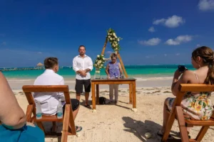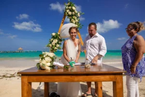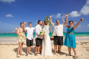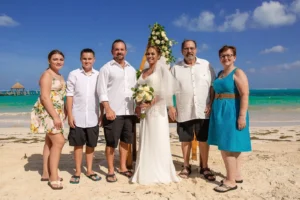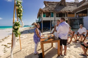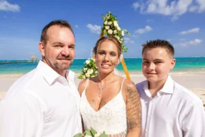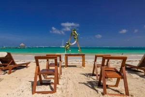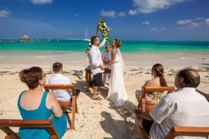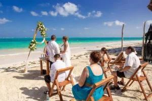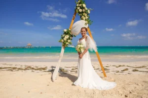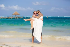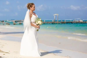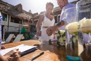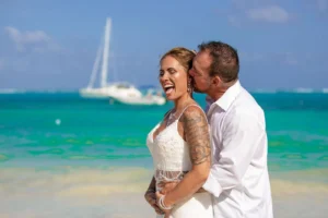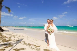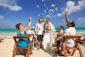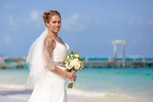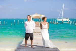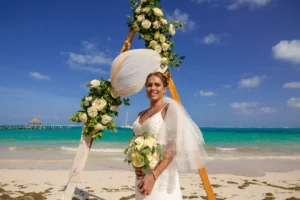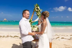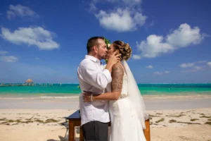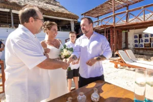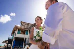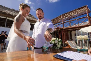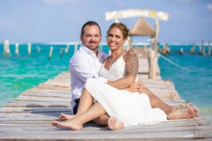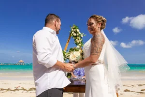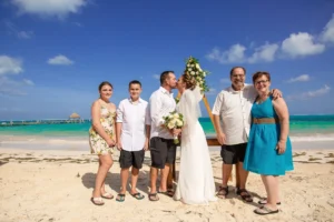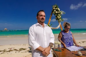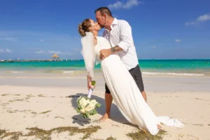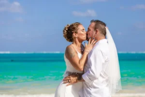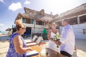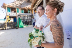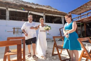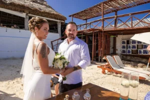 Jeff and Ashley’s Dream of a simple beach wedding on the Riviera Maya almost got swept away by a hurricane that hit just two days before the ceremony. Luckily, the storm had an unexpected benefit – it cleared the beaches of sargassum seaweed, a common issue in the region. This last-minute twist turned into a blessing in disguise, allowing them to have a beautiful ceremony with pristine sand and crystal-clear water.