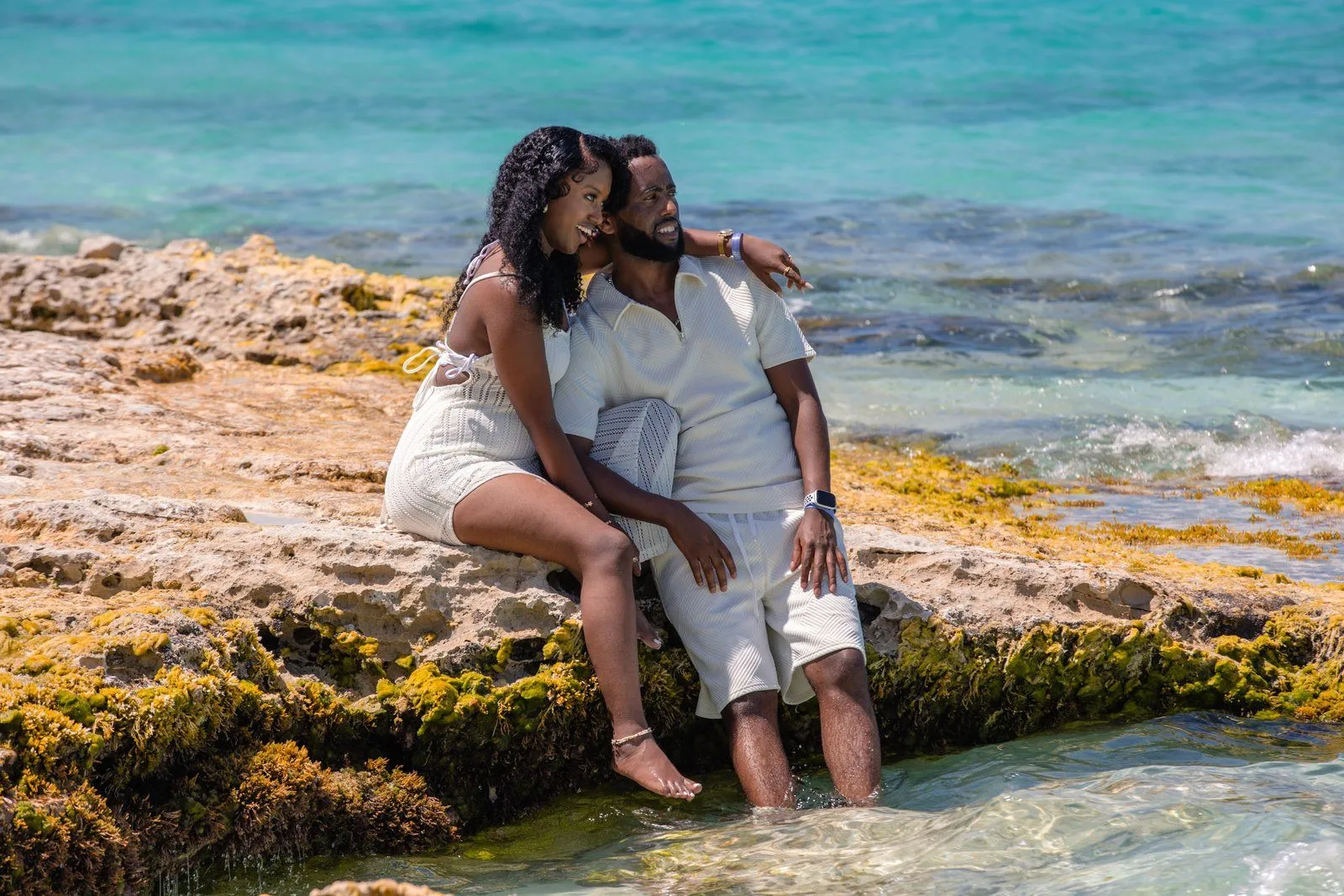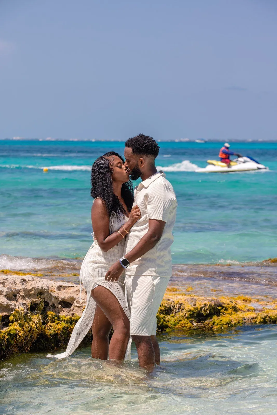 Despite the midday sun, the Cancun ocean shimmered in its iconic turquoise, providing a breathtaking backdrop. We embraced the bright light, creating vibrant images that truly capture the essence of a Cancun beach photoshoot. To add variety, Eden chose multiple outfit changes, resulting in a diverse and dynamic collection of romantic photos. From playful moments to tender embraces, every shot reflects their love amidst the beauty of Cancun’s white sand beaches. If you’re searching for a professional photographer in Cancun to capture your special moments, look no further!