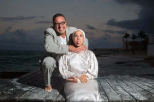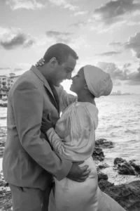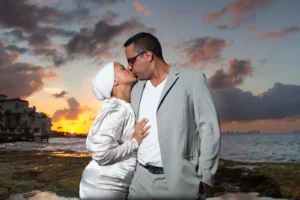As the sun dipped below the horizon, casting a fiery glow across the sky, we captured Raja and Mouna’s love story. The soft, golden light accentuated the pristine beach and the couple’s genuine joy. Their laughter echoed as we explored the shore, the sound blending with the rhythm of the waves. The session culminated with them gazing into each other’s eyes, silhouettes against the breathtaking sunset.