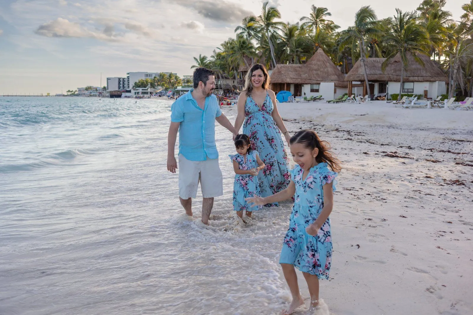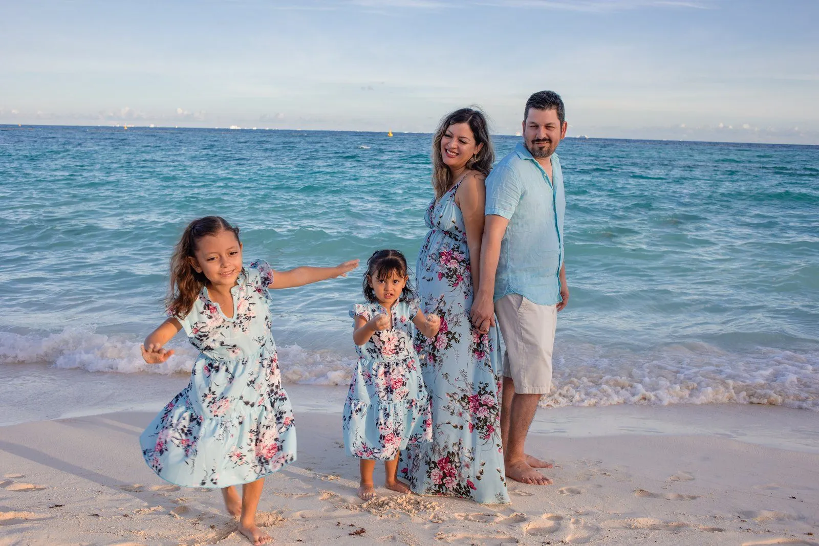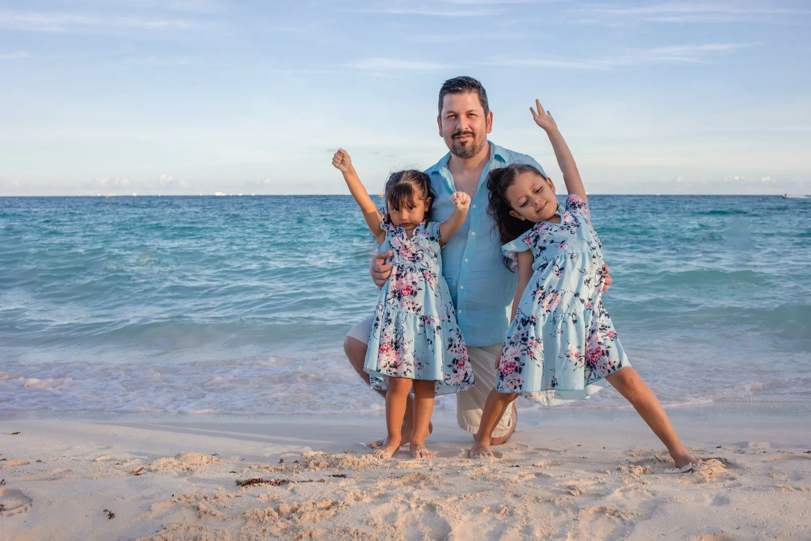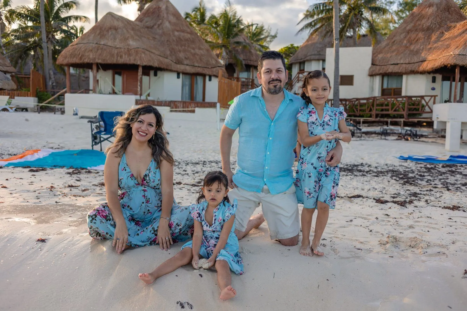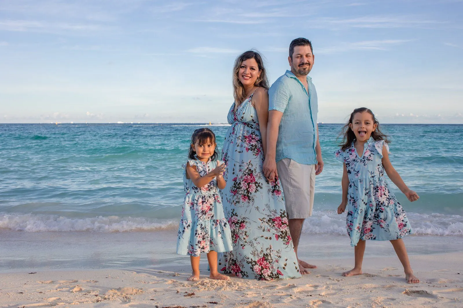 Five years ago, Pamela from Chihuahua City first experienced the magic of a Cancun photoshoot with us during a family wedding. She loved how we captured her family’s reunion, preserving those precious memories. Now, she’s returned to us for another special session, this time with just her husband and daughters, in beautiful Playa del Carmen.