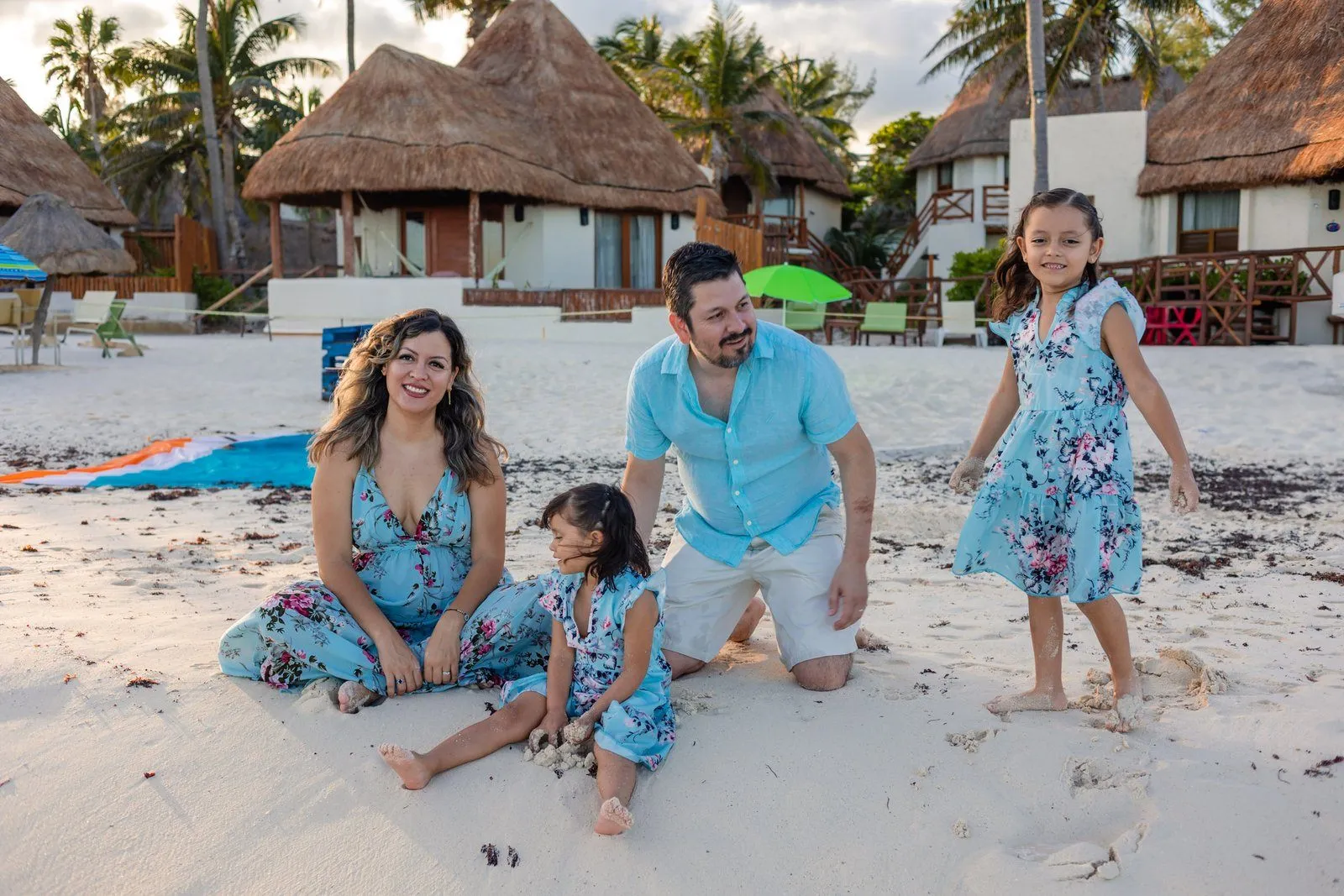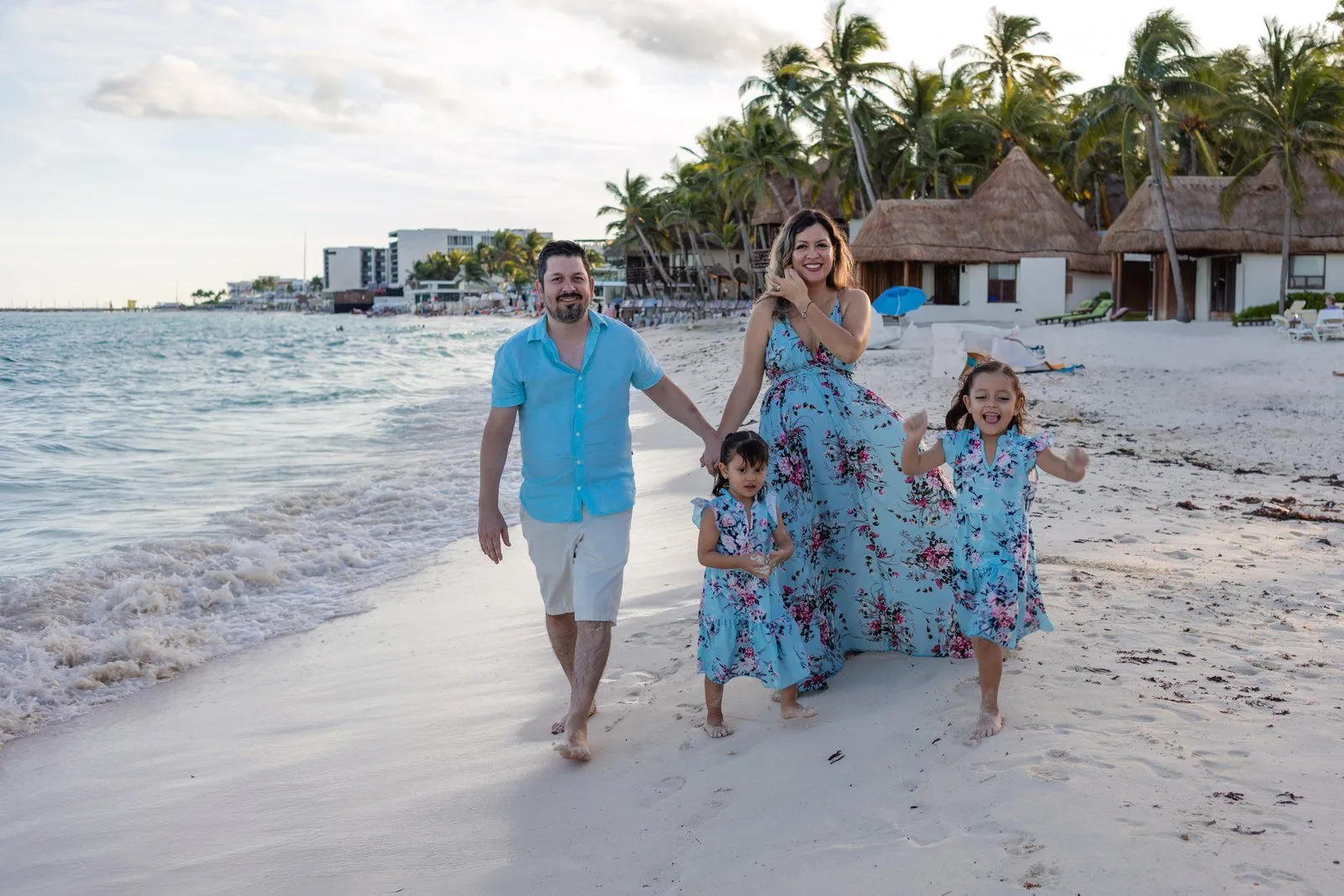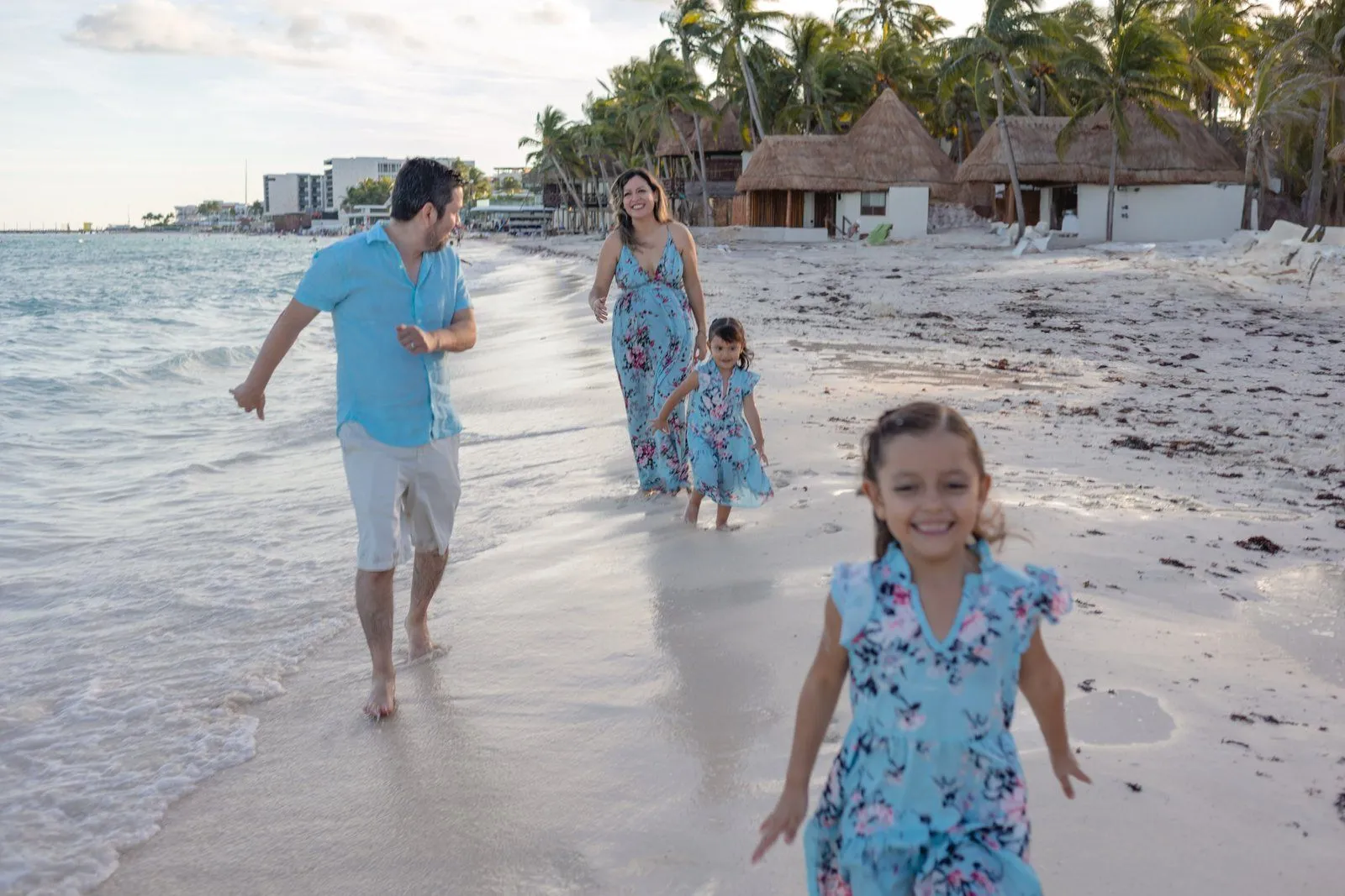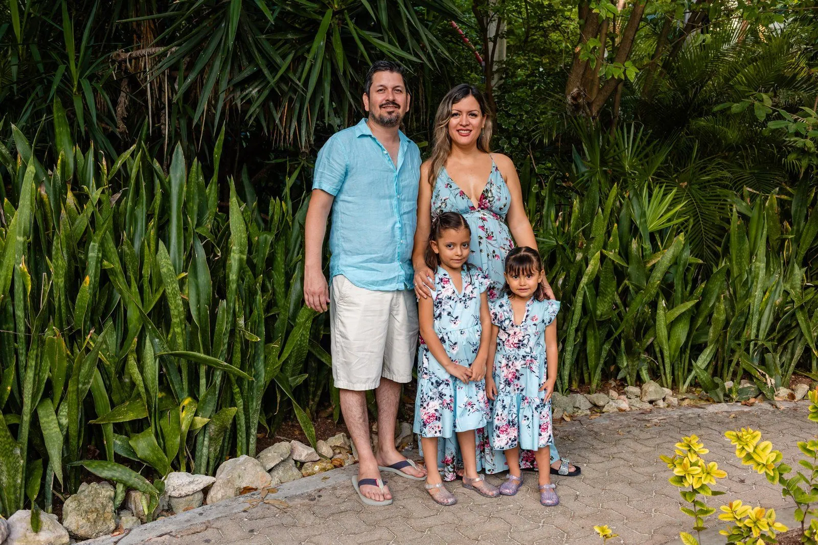 Five years ago, Pamela from Chihuahua City first experienced the magic of a Cancun photoshoot with us during a family wedding. She loved how we captured her family’s reunion, preserving those precious memories. Now, she’s returned to us for another special session, this time with just her husband and daughters, in beautiful Playa del Carmen.