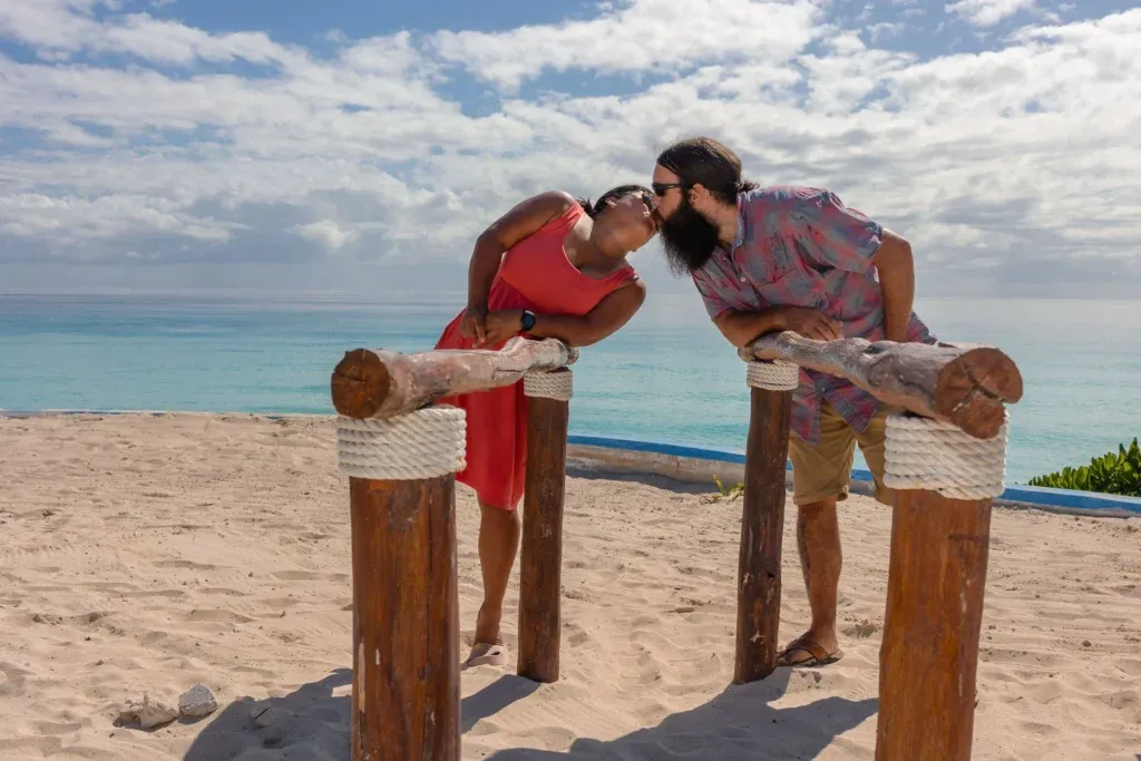 We chose Playa Delfines for their session, a location renowned for its vibrant turquoise waters and expansive white sands. What makes this spot a favorite for any professional photographer in Cancun is its incredible versatility. Beyond the famous “Cancun” sign, the beach offers various natural backdrops—from elevated scenic viewpoints to the soft rolling surf—providing multiple “looks” within a single session.