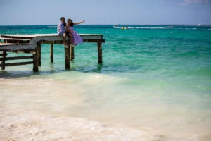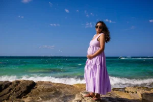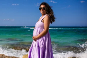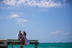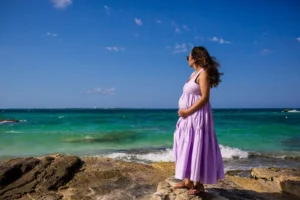 Our photoshoot unfolded at the picturesque Playa Caracol. The stunning beach, with its iconic pier and rocky formations, provided a perfect backdrop for capturing this growing family’s joy. The vibrant natural scenery beautifully complemented the beauty of the mother’s pregnancy stage.