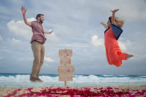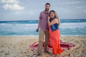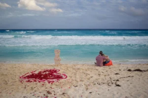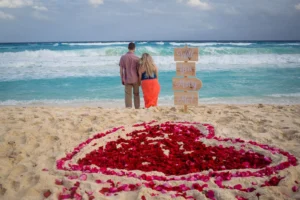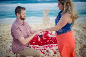 Love was in the air at Marlin Beach, Cancun, during a recent surprise engagement session. The groom-to-be, L, contacted us to capture a truly special moment: a surprise proposal for his beloved N. To make the occasion even more unforgettable, L enlisted the help of a proposal planner who orchestrated a beautiful heart-shaped arrangement on the pristine white sand.