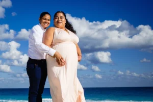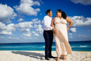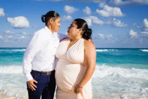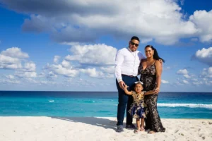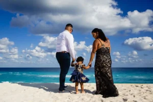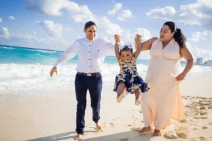 Playa Delfines, with its breathtaking turquoise waters and pristine white sand, provided the perfect backdrop for capturing the family’s joy and connection. The Daniel Olmedo Photographer team worked closely with the family, ensuring everyone felt comfortable and relaxed throughout the session. We focused on capturing natural interactions and genuine smiles, creating images that truly reflect their bond.