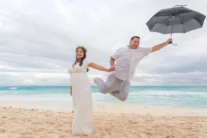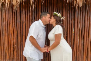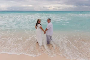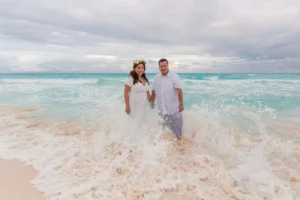 The session took place on the stunning beach of the JW Marriott Cancun. Though the afternoon was cloudy, the beauty of the Caribbean was undeniable. The sea glowed with an intense green, creating a magical backdrop for their photos.