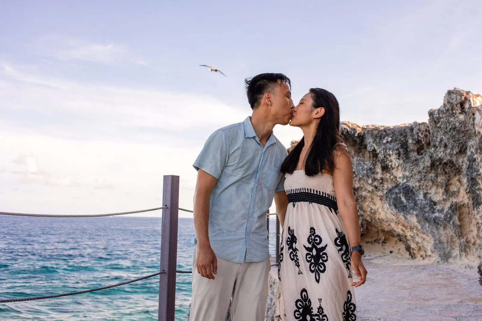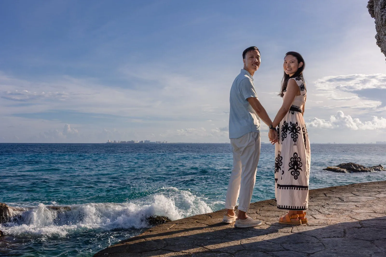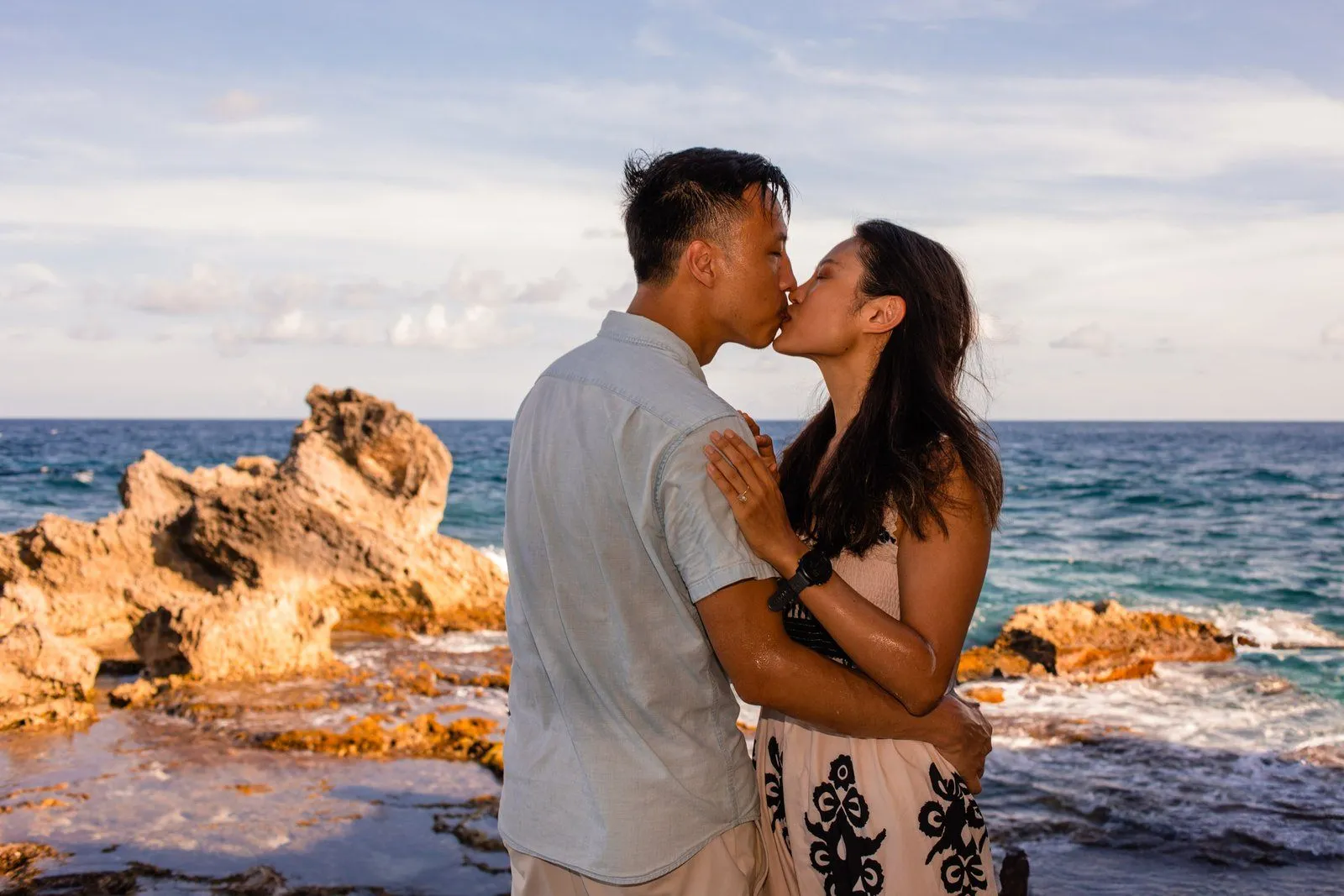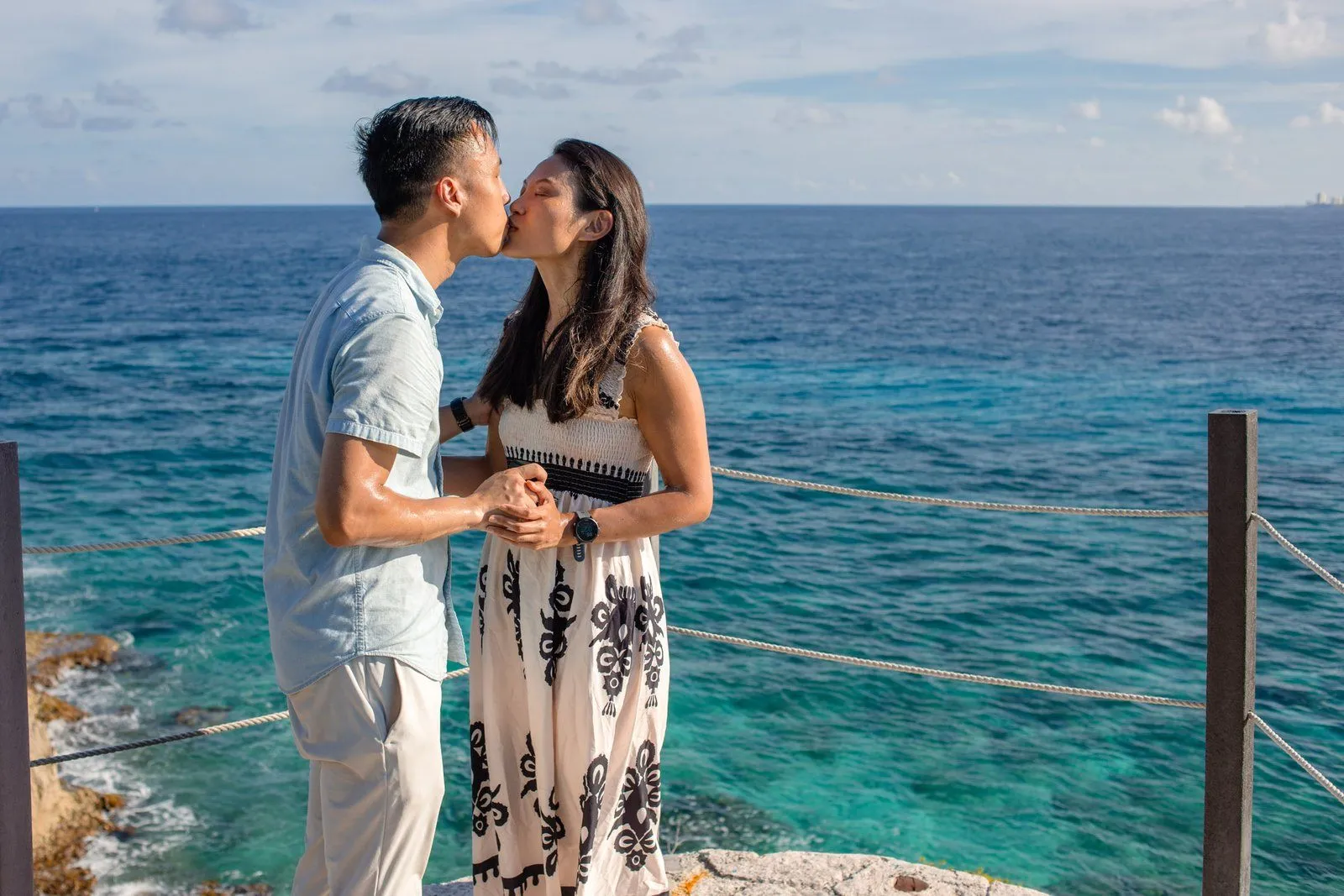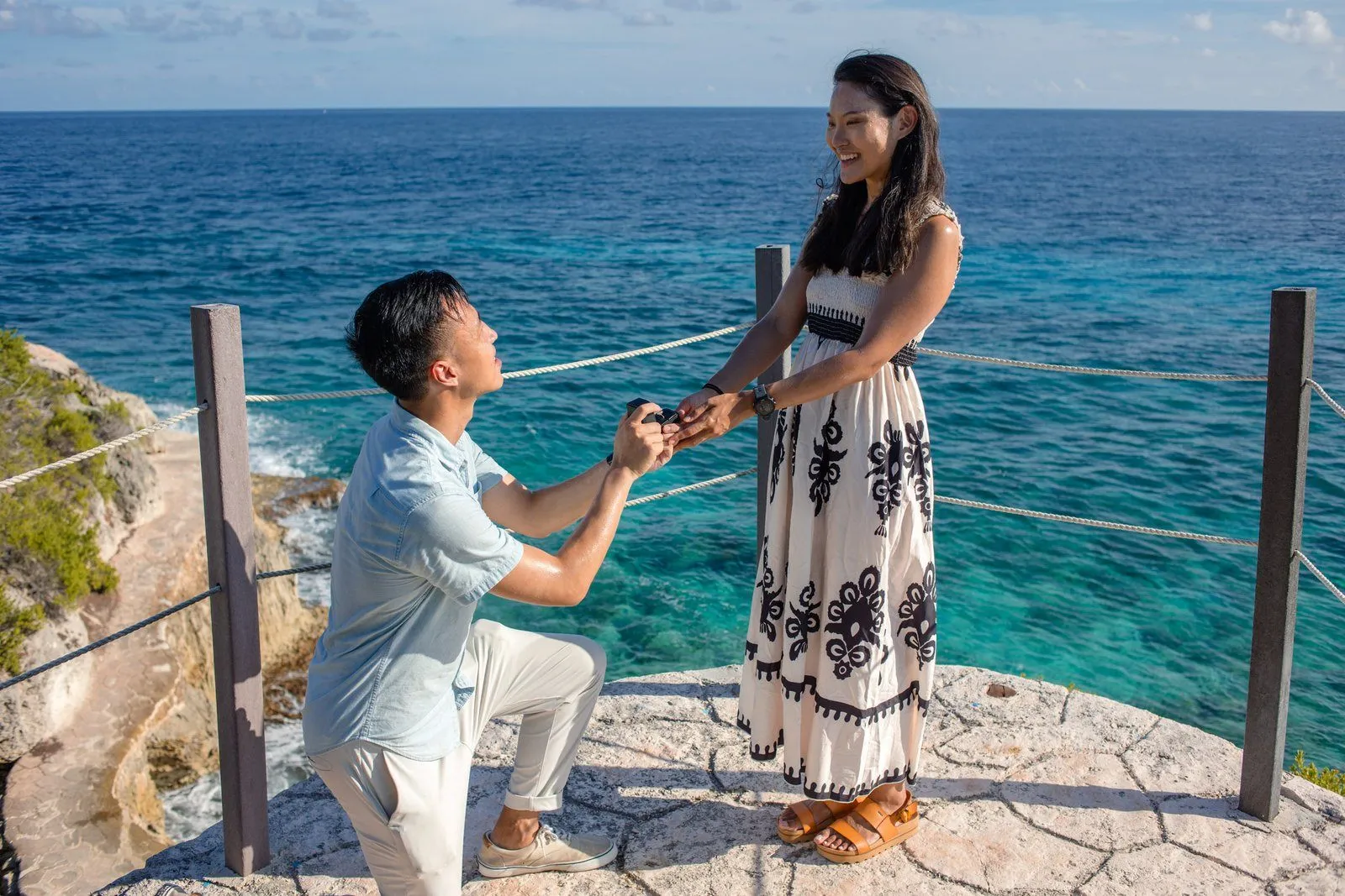 We met that afternoon at the stunning Punta Sur, a picturesque location perfect for a romantic proposal. I discreetly posed as a landscape photographer, capturing the scenic beauty while waiting for the perfect moment. As they walked by, a subtle signal guided his girlfriend into position. The surprise was absolute! Her face lit up with pure joy as she turned to see Kevin on one knee, holding the engagement ring.