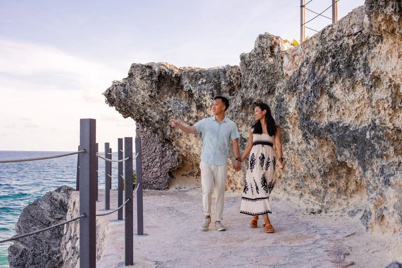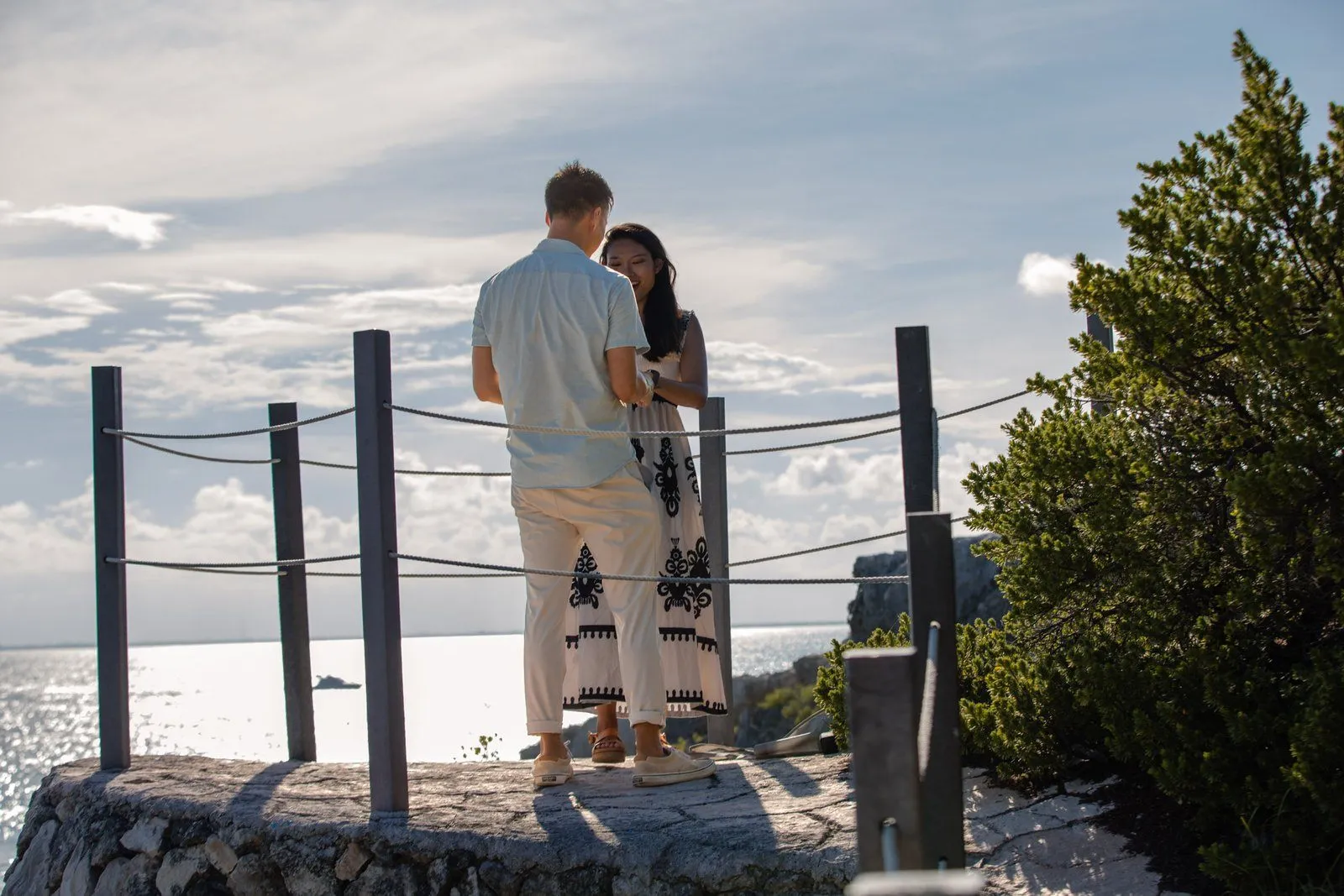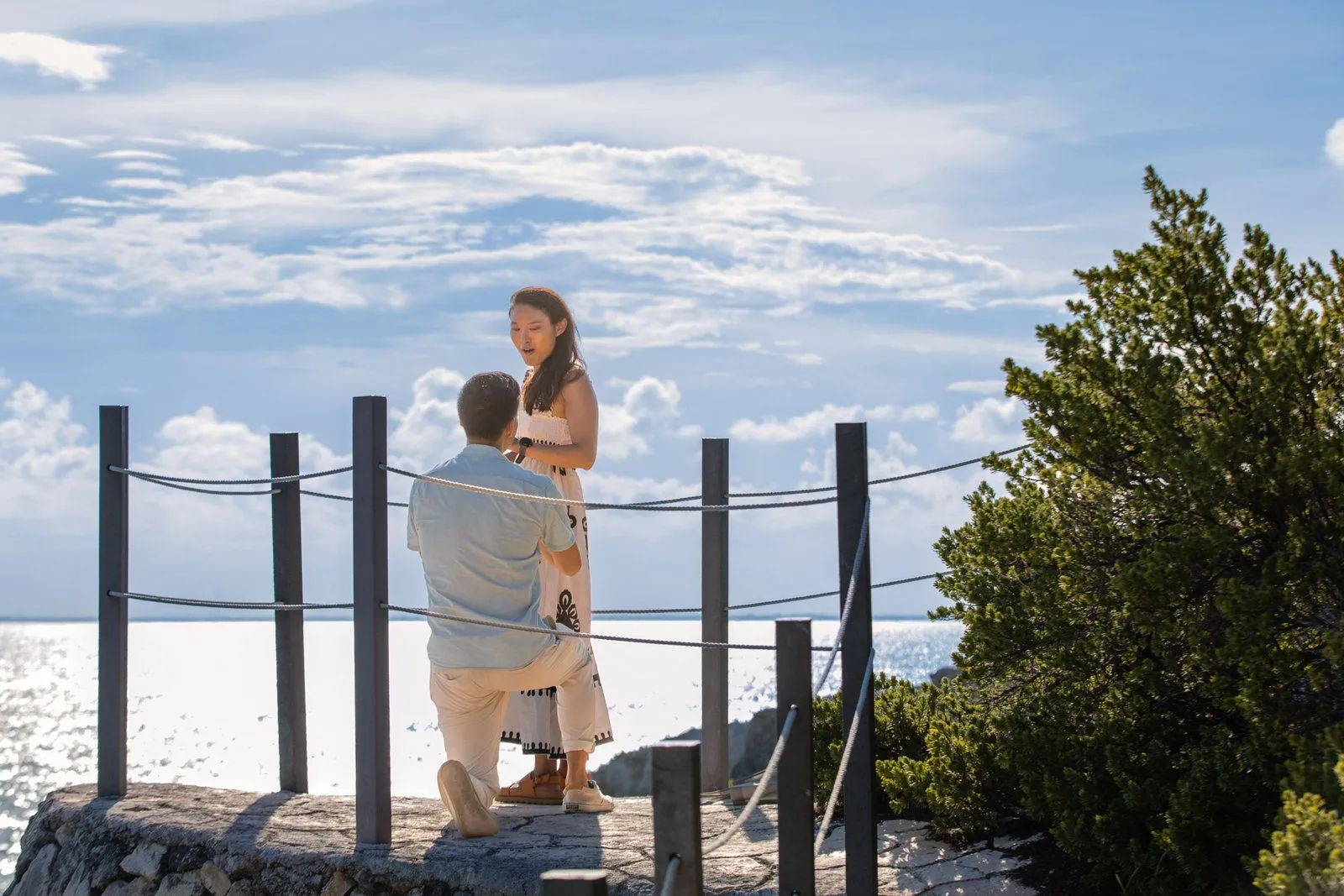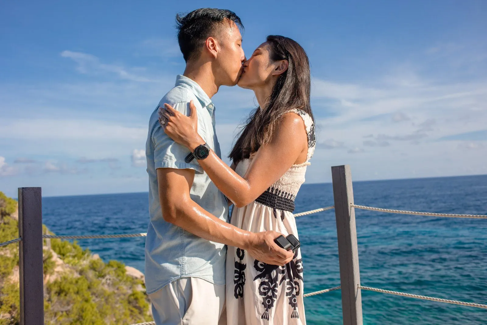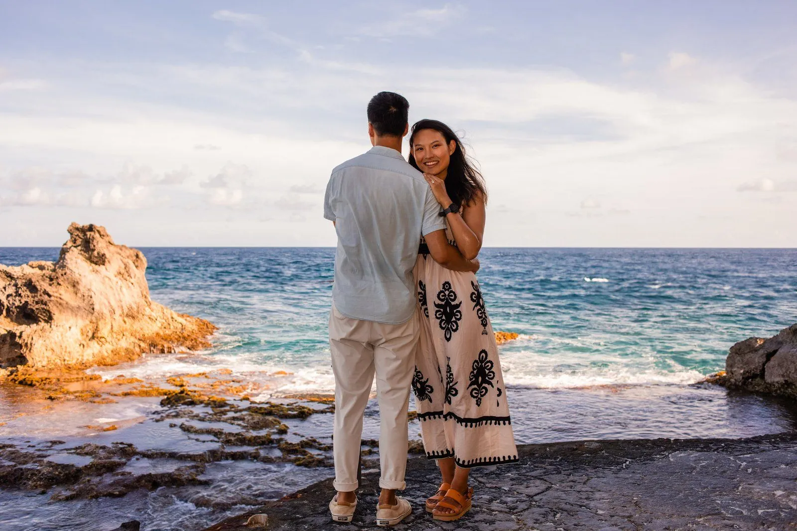 We met that afternoon at the stunning Punta Sur, a picturesque location perfect for a romantic proposal. I discreetly posed as a landscape photographer, capturing the scenic beauty while waiting for the perfect moment. As they walked by, a subtle signal guided his girlfriend into position. The surprise was absolute! Her face lit up with pure joy as she turned to see Kevin on one knee, holding the engagement ring.