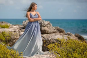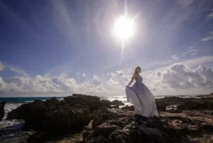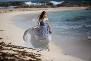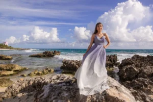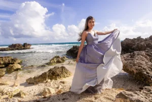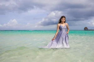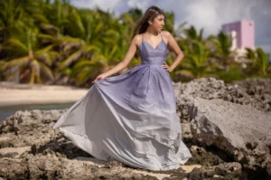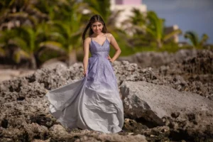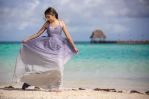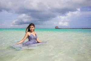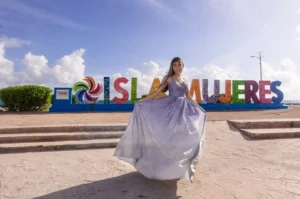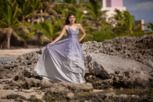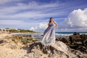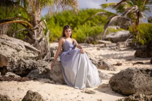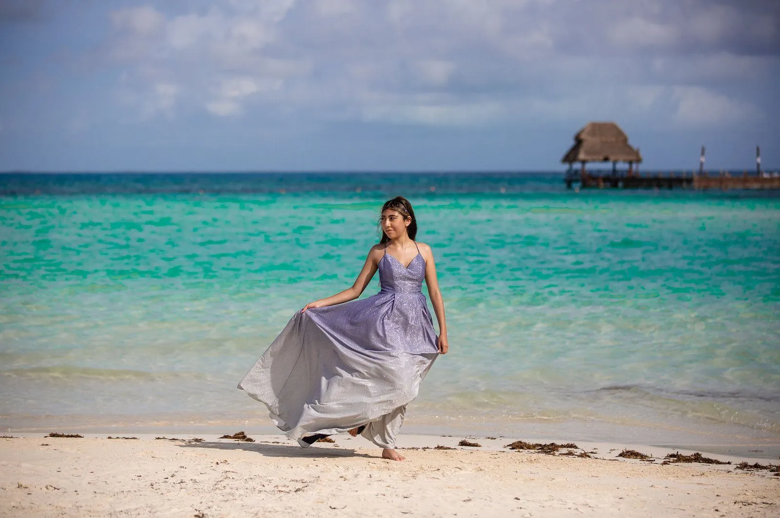 The idyllic Isla Mujeres served as the picturesque backdrop for Paola’s quinceañera photoshoot. Taking advantage of the soft morning light, we photographed her stunning XV dress by the turquoise waters. The pristine beaches and crystal-clear ocean offered a captivating contrast to the elegance of her gown, creating a magical atmosphere that embodied the spirit of this significant event.