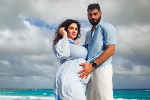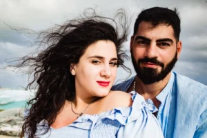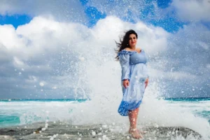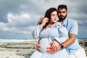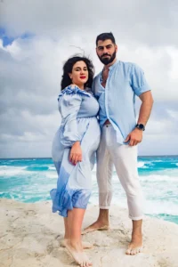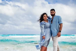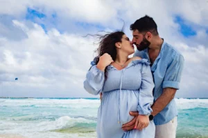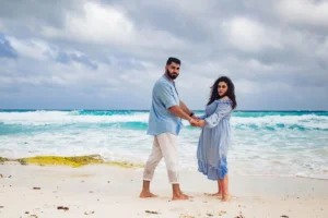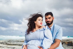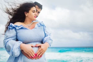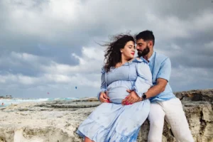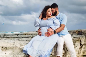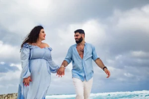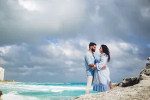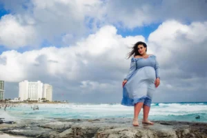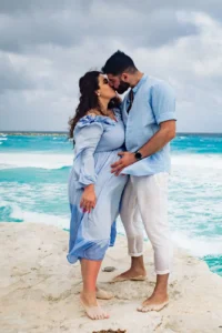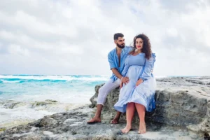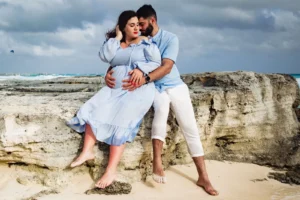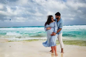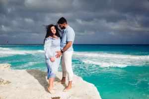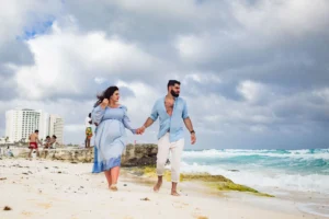 Inessa and Boris journeyed from Armenia to the sun-kissed shores of Cancún for a well-deserved vacation, seizing the opportunity to capture a special moment in their lives: their anticipation of a new arrival. The chosen backdrop for their maternity session was the picturesque Playa Gaviota, bathed in the soft afternoon light. While the sky was overcast, the elements conspired to create a dramatic and beautiful scene.