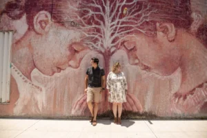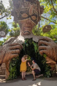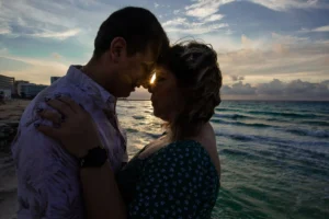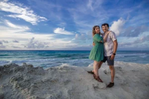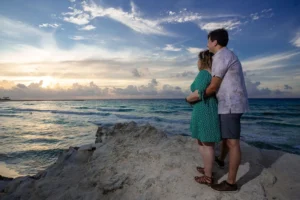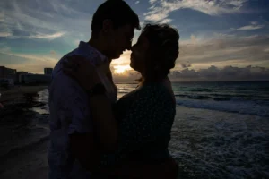 Our day began with a magical sunrise in Cancun, where the soft golden light perfectly highlighted their connection. From there, we traveled to the bohemian paradise of Tulum where we recreated the handing over of the engagement ring at the mother earth sculpture, with its turquoise waters and rustic charm providing a dreamy backdrop. Finally, we concluded the session in the serene and picturesque Puerto Morelos, where the tranquil beaches and vibrant colors added the perfect finishing touch.