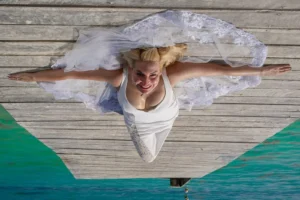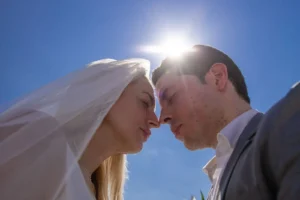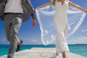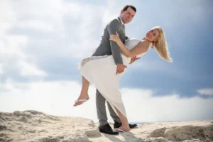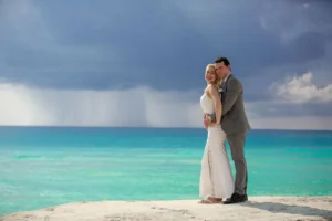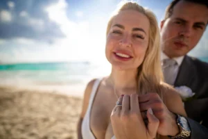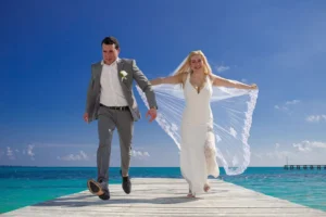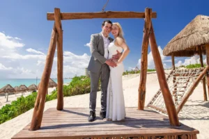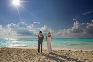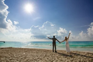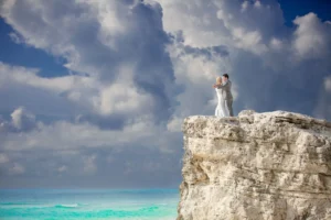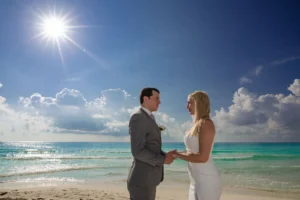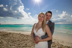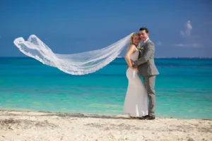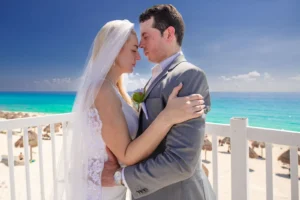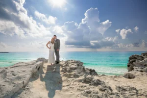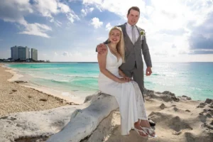 Sweethearts Kelly and Juan tied the knot in Atlanta, Georgia and traveled to the idyllic beaches of Cancun for their honeymoon. They sought out a Cancun wedding photographer to capture the magic of their romantic getaway, and I was the one they entrusted with the special task of documenting their love story against the stunning backdrop of Cancun’s turquoise waters and fine sand while dressed in their wedding dress and suit.
