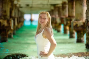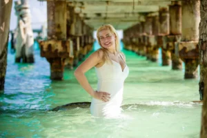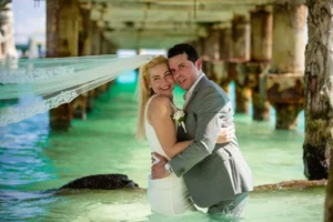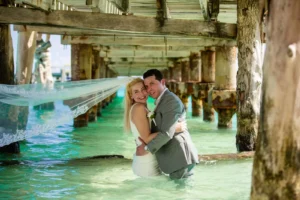 We spent an unforgettable day creating beautiful memories, capturing their fun moments and heartfelt connection as they walked hand in hand along the shore. The chosen beaches were Playa Delfines, Playa Gaviotas and we ended up at Playa Caracol where they ended up in the water under a pier capturing these fantastic photos. Under the beautiful Cancun sun, we provided a stunning scene at the conclusion of their photo shoot, perfectly encapsulating the joy and love that filled their honeymoon.