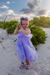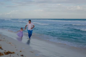 Playa Delfines, with its picturesque playground and pristine shoreline, provided the perfect setting for the photoshoot. Victoria’s infectious laughter filled the air as she playfully explored the beach, her joy adding a heartwarming touch to each capture. Belem and Oscar shared tender moments with their daughter, their love and connection radiating through every frame. The crystal-clear waters and golden sands of Dolphin Beach formed a stunning backdrop, further enhancing the charm of the session.
